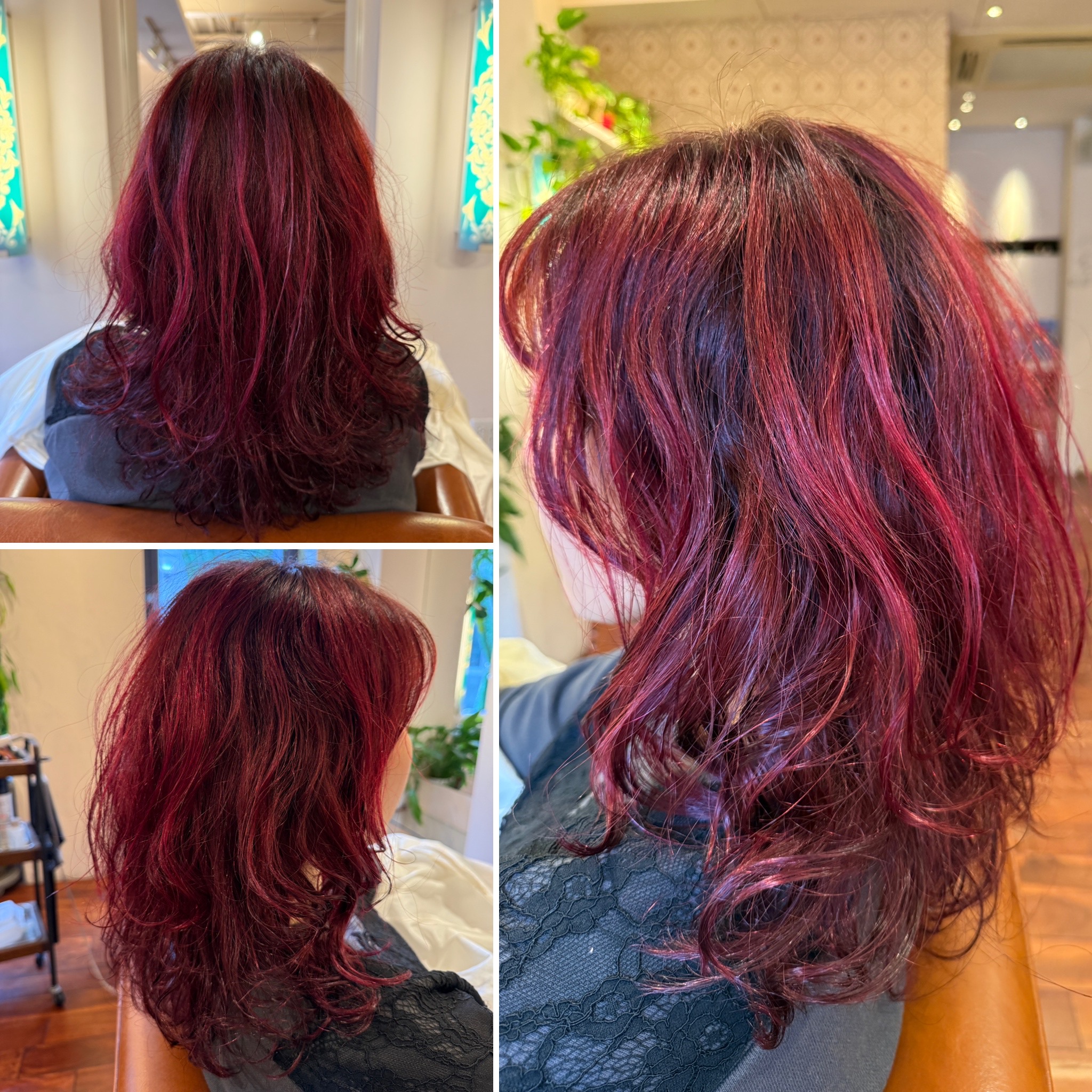 毛先の褪色していた部分にピンクレッドをオン。